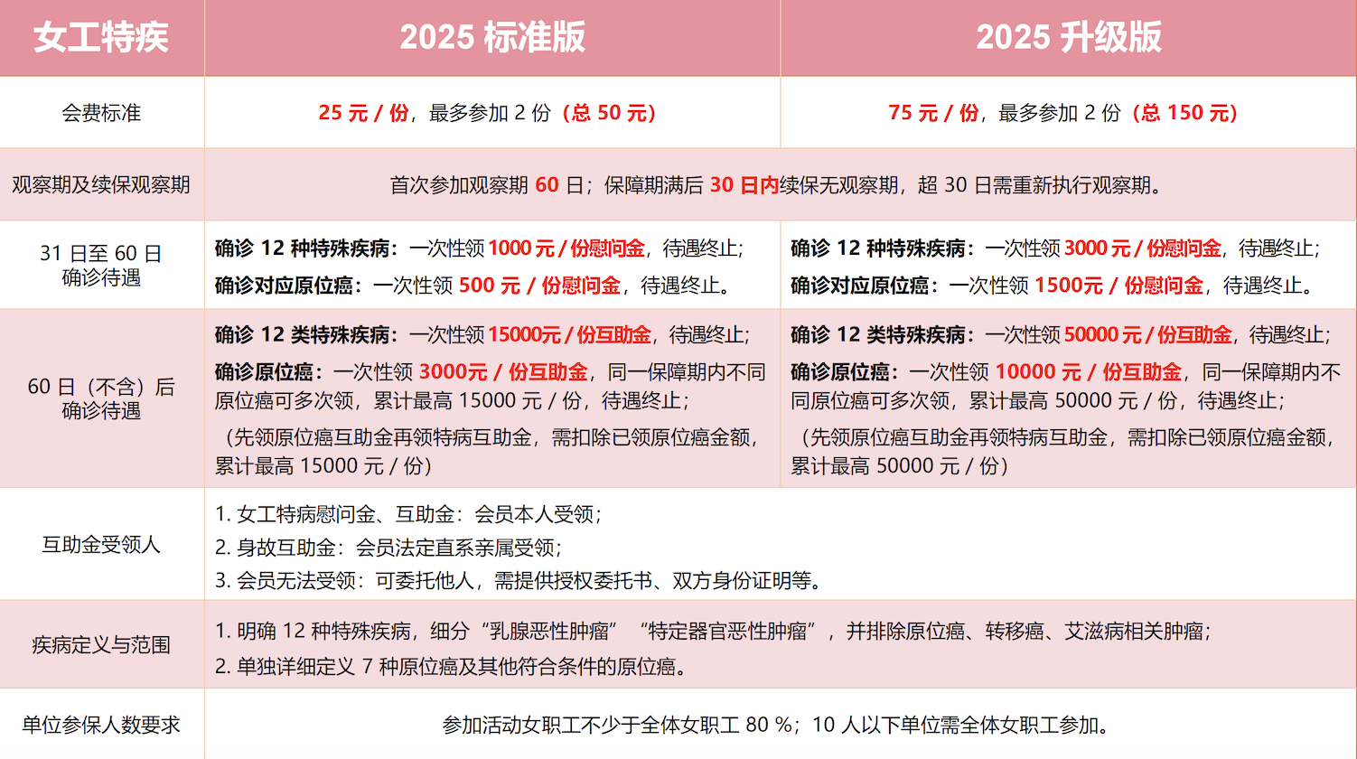 在职女职工特殊疾病互助保障活动又升级了!一是选择更宽,结合职工不同需求,设立了基础版和升级版;二是报销更多,保障金额由6千元增至基础版的1万5千元,升级版更是加大到5万元;三是范围更广,涵盖病种在原有的乳腺癌等4种基础上,扩展至恶性葡萄胎等12种;四是服务更暖,观察期由120天缩短至60天,且参保31日至60日内确诊也能领取慰问金。